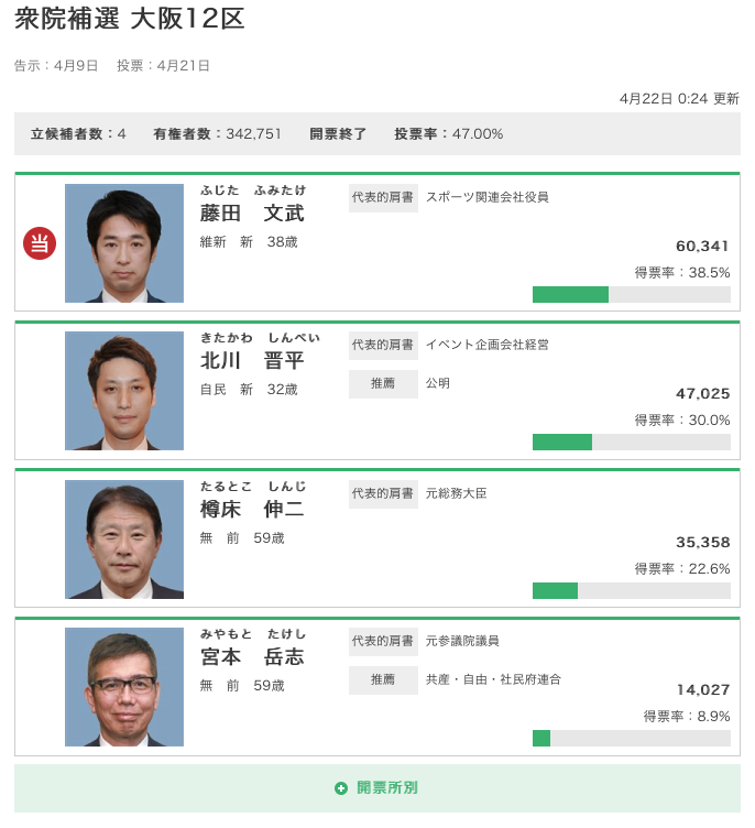 →21日 衆院大阪12区補選 自民支持層の2割超、維新候補に投票 出口調査