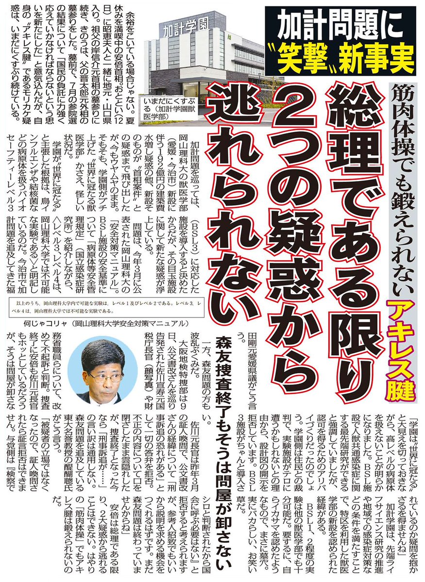 日刊ゲンダイ 加計問題に“笑撃”の新事実 BSL施設は高レベル病原体扱えず