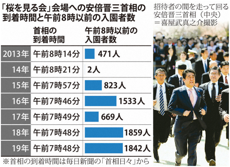【税金で後援会活動】税金で行われた「桜を見る会」が、首相が会場の新宿御苑に到着した時間帯に合わせ、8千人の首相の後援会関係者が手荷物検査もなしに入園した疑惑。首相は2015年以降、正式な開門・開園時刻(午前8時半)より早い午前8時… https://t.co/WQX7BaxFH8