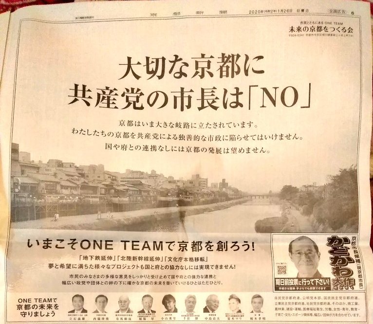福山候補に対する門川陣営のデマ広告にある「国や府との連携なしには京都の発展は望めない」というフレーズは、京都市長候補として純粋にアウトだろう。京都市の可能性を最初から否定しているのだから。ちなみに、福山候補の政策には「国や府との繋がりを大切にして自治力を伸ばす」と書かれている。
