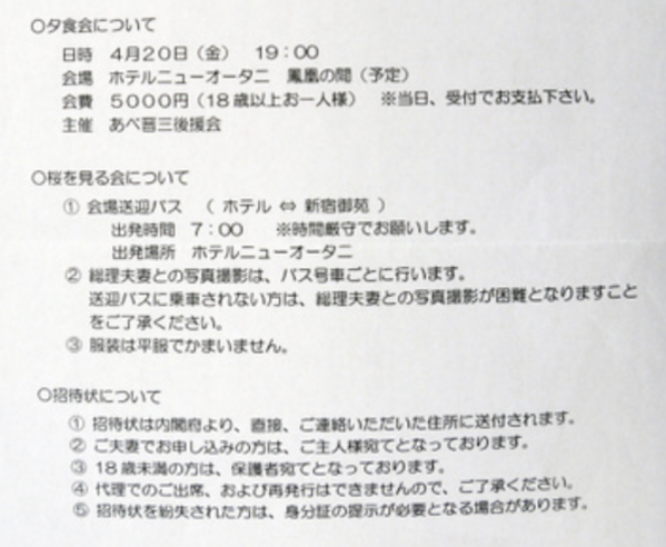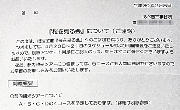 で、もう1つ付け加えると、アベ事務所は内閣府から招待状が発送される前に、このようなツアー案内を送っております。