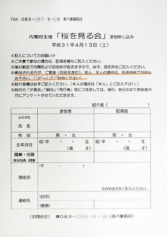 「功労・功績があった人」を「招待」するハズの「桜を見る会」に、アベ事務所が講演会関係者に参加申込書を配って参加者を「募集」していたので。