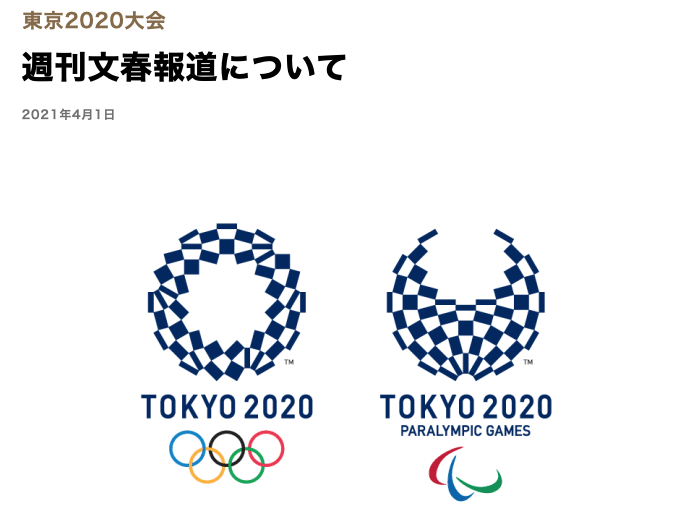対象の文春オンライン4月1日発売の週刊文春、及び、昨日3月31日に文春オンラインに掲載された東京2020大会開閉会式関連の記事内容につきまして、同メディアは、開閉会式制作チームのメンバーだったMIKIKO氏のチームがIOCにプレゼンした280頁に及ぶ内部資料(昨年4月6日付)を入手したとして、資料に記載の演出内容に言及し、また、一部の画像を掲載しており、東京2020組織委員会としては極めて遺憾です。