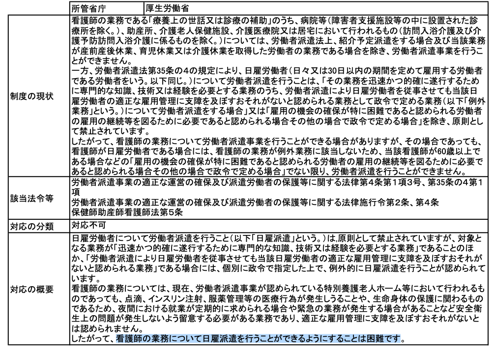 厚労省の結論は看護師に日雇い派遣は困難とはっきり書いてある。